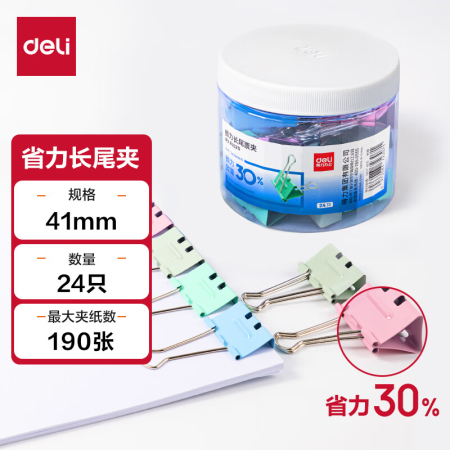 商品名稱:得力8552S 省力長尾夾 2#41mm大號彩色金屬票夾燕尾夾票據(jù)文件夾子 辦公用品 24只/筒