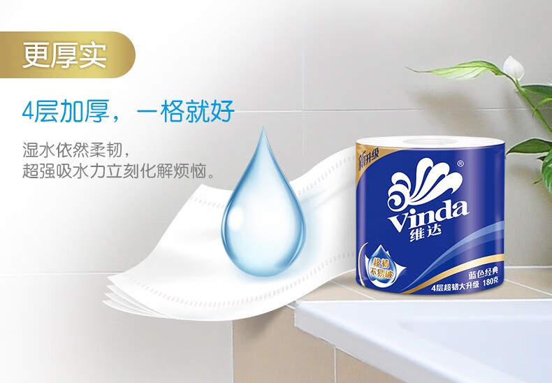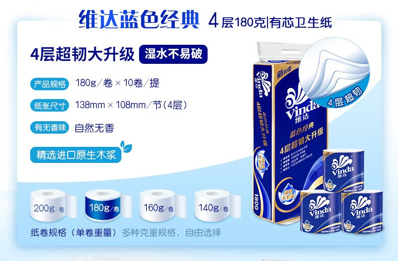 商品名稱:維達(dá)V4028 藍(lán)色經(jīng)典系列有芯卷紙 家用廁紙衛(wèi)生紙 4層180克*10卷/提