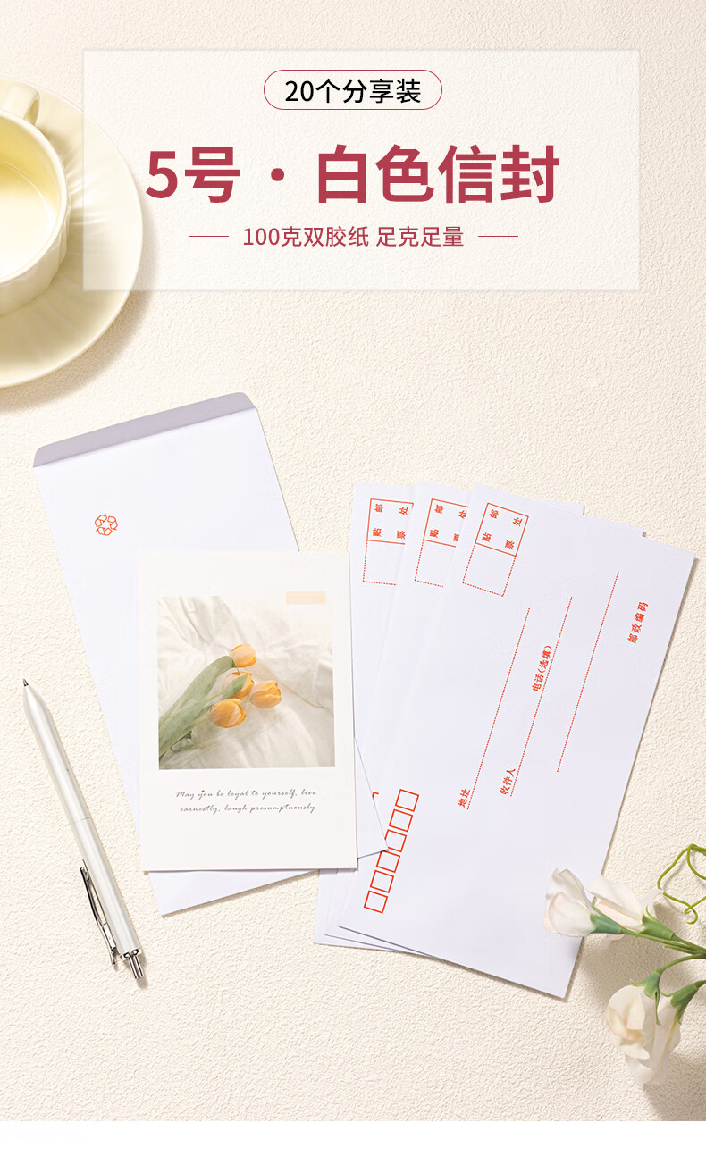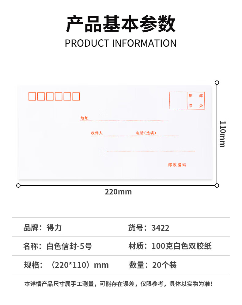 商品名稱:得力3422 白色信封 5號郵局標準信封220*110mm 20張/包