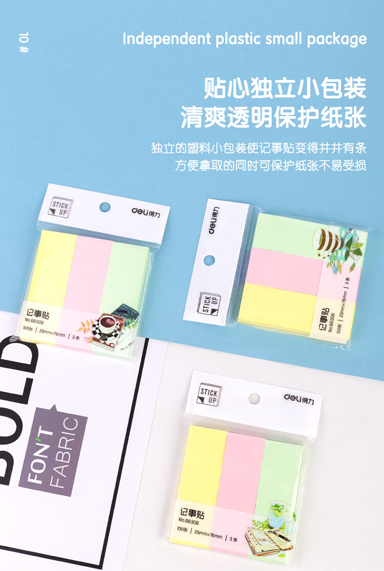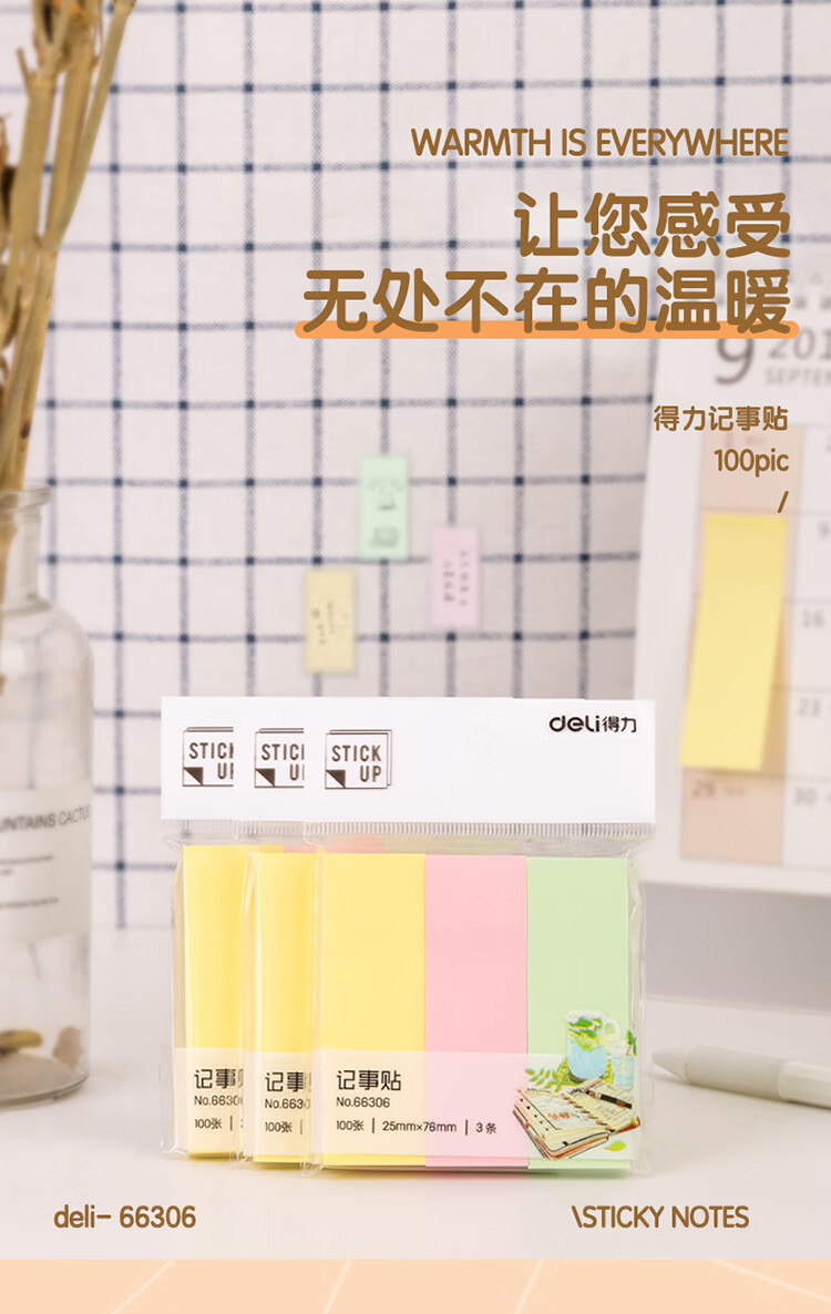 自營得力66306 便利貼 3色分條便簽紙 76*25mm記事貼 300張/包