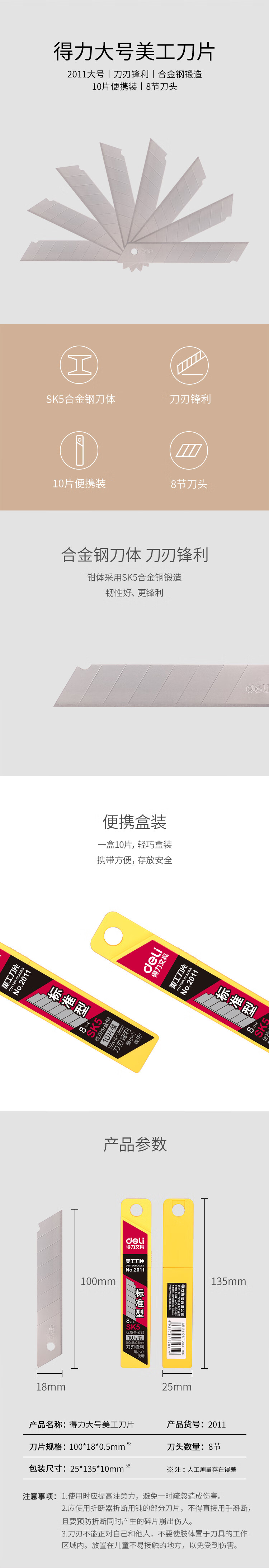 商品名稱:得力2011 美工刀片 8刀頭SK5合金鋼大號(hào)裁紙刀片便攜裝 辦公用品 10片/盒