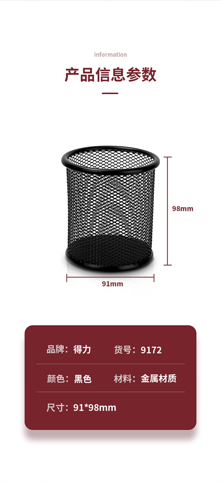 商品名稱:得力9172 金屬網(wǎng)紋圓形筆筒 簡約創(chuàng)意桌面收納盒 辦公用品 黑色 單個裝