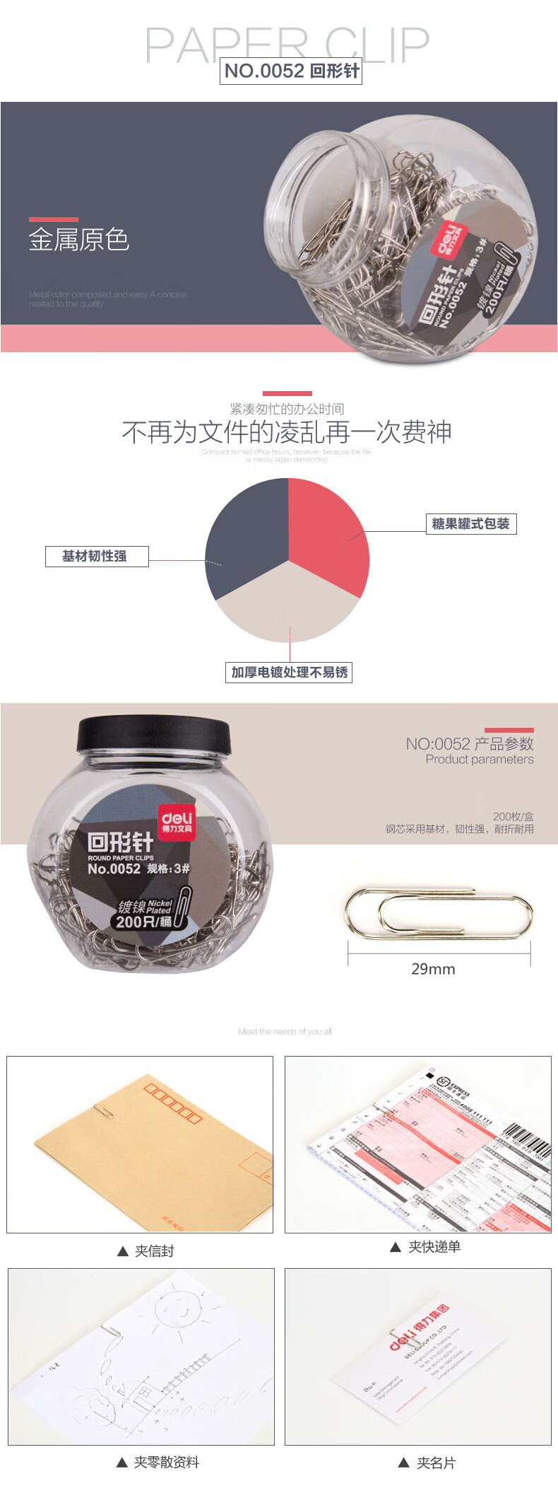 商品名稱:得力0052 鍍鎳回形針 3號29mm金屬防銹曲別針 辦公用品 200只/桶