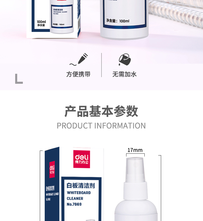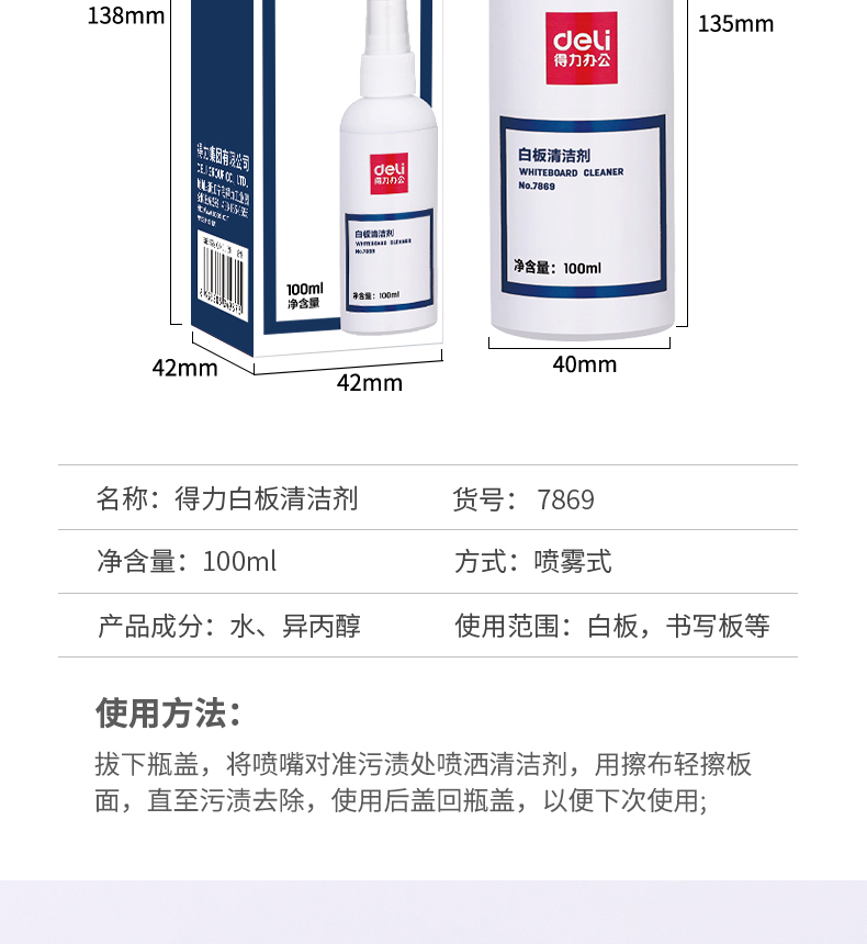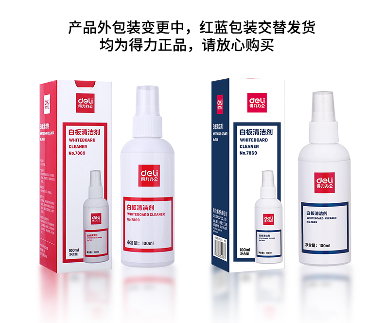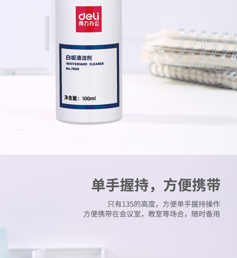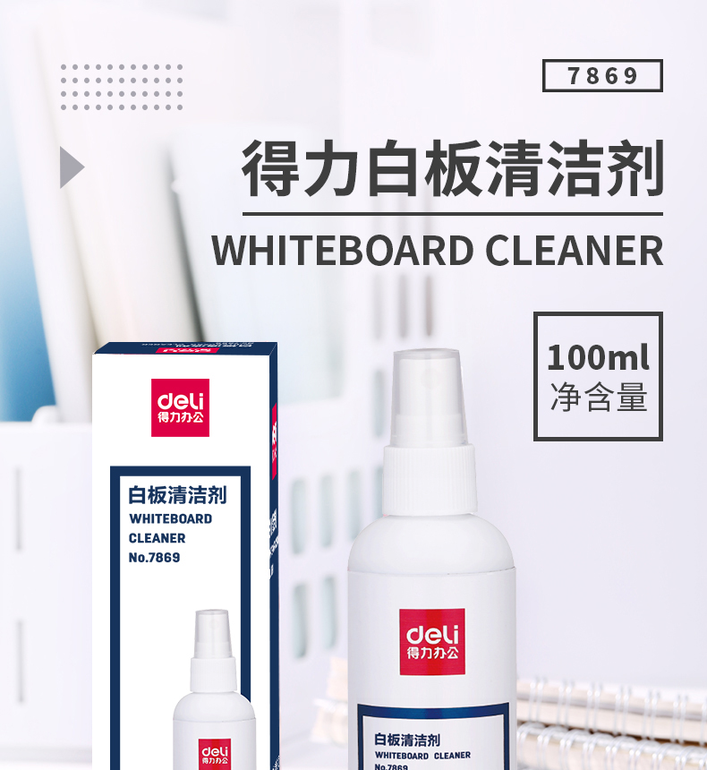 商品名稱:得力7869 白板清潔劑 100ml擦除消除液清潔劑神器清洗劑去污清洗液 單位:瓶
