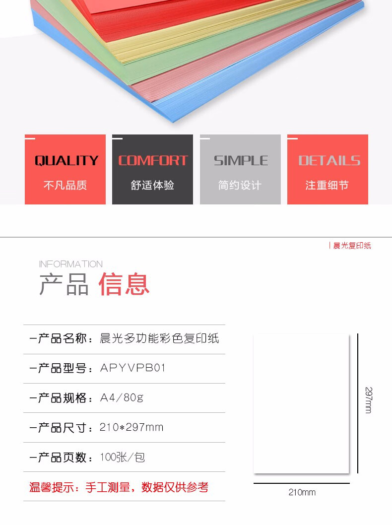 商品名稱:晨光A4/80g彩色多功能打印紙 手工紙復(fù)印紙 100張/袋APYVPB0131
